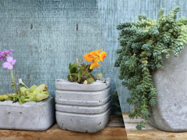 여러 개의 콘크리트 화분을 한 번에 만들어 아름다운 작품으로 만들 수 있습니다. 사진에 예시가 나와 있습니다. 여러 개의 틀을 만들어 화분들을 퍼즐처럼 맞춰 하나의 작품으로 만들면 됩니다.