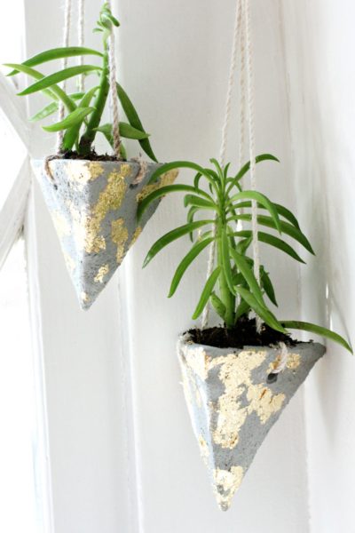 공간이 부족하면 화분을 걸어둘 수 있습니다. 이렇게 하려면 삼각형 금속판이 필요합니다. 그 위에 3~5mm 두께로 시멘트 모르타르를 바르세요. 세 개의 금속판을 만든 후, 시멘트 모르타르로 이음새를 메워 하나의 구조물로 만듭니다. 모르타르가 완전히 굳기 전에 각 면에 구멍을 뚫으세요. 이 구멍에 밧줄을 꿰어 고정합니다.