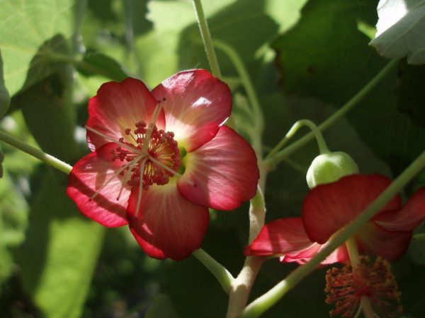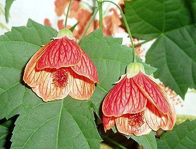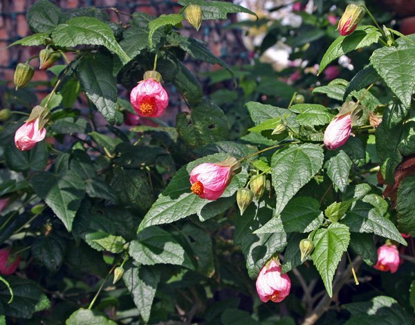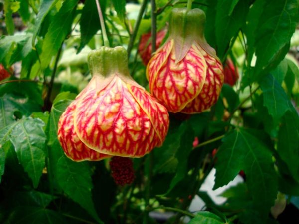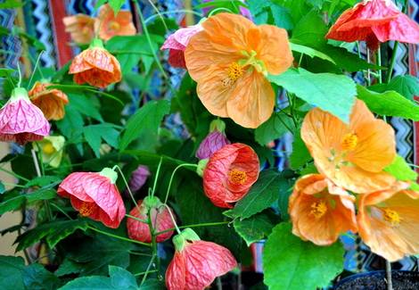 - 아부틸론 메가포타미눔쐐기 모양 꽃잎의 진홍색 밑동 때문에 "중국 등불"이라는 별명이 붙었습니다. 종종 덩굴식물로 키우는데, 독립된 지지대에 지지대를 세워야 합니다. 가장자리를 따라 톱니 모양의 타원형 잎은 진한 녹색이나 에메랄드빛을 띱니다. 꽃차례는 홀로 피고, 꽃잎은 레몬색, 주황색, 또는 보라색을 띱니다. 적절한 미기후와 적절한 관리만 잘 된다면 일 년 내내 꽃을 피웁니다.
