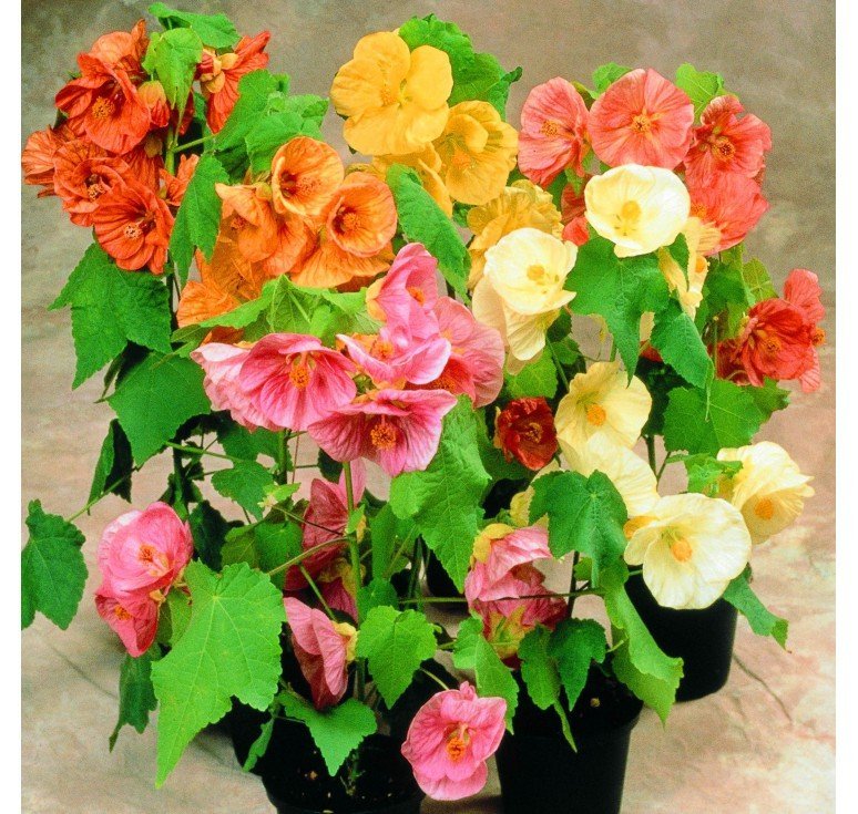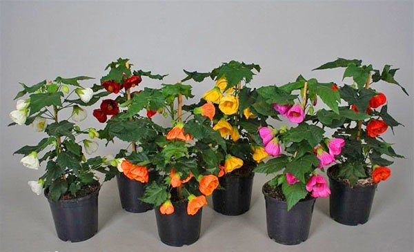 - 아부틸론 하이브리드– 키가 최대 1.5m에 달하는 관목과 아관목을 포함한 다양한 품종이 있습니다. 하트 모양이나 달걀 모양의 잎은 양면에 뻣뻣한 털이 덮여 있습니다. 종 모양의 꽃은 낱개로 또는 쌍으로 핀다. 색상은 순백색에서 진한 적갈색까지 다양합니다.