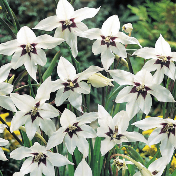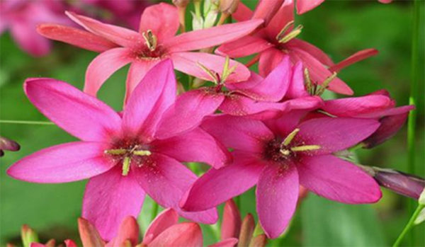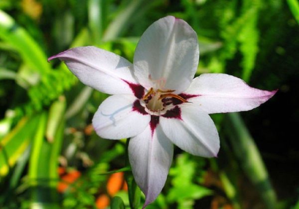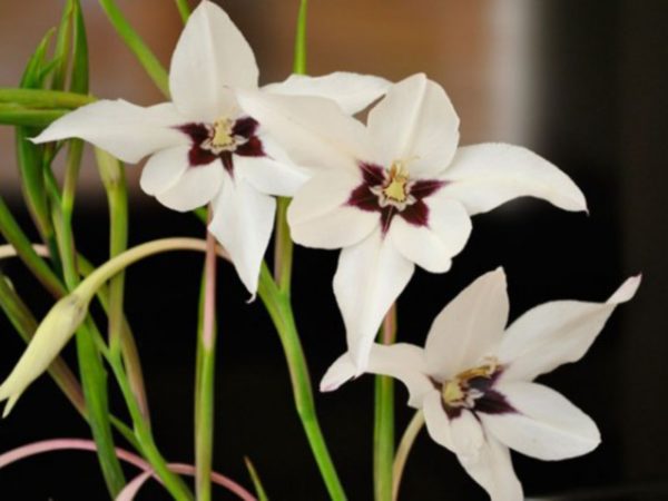 - 이시아 파니쿨라타(Ixia paniculata)는 매우 아름다운 꽃을 피웁니다. 꽃은 흰색이며, 반점 대신 보라색 맥이 있습니다.