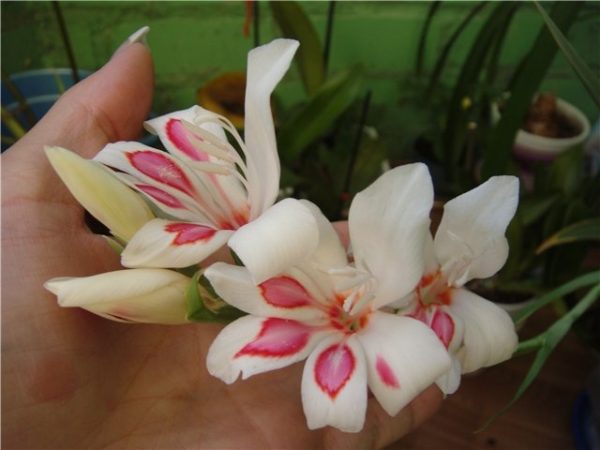 아시탄테라(acidanthera)의 가을 관리에는 시든 꽃봉오리를 즉시 제거하는 것이 포함됩니다. 이렇게 하면 개화 기간이 연장됩니다. 특히 가을 날씨가 불안정하고 춥고 잦은 장기간 비가 내리는 경우, 과망간산칼륨 용액(물 10리터당 5g)을 사용하여 물을 줄 수 있습니다. 혹독한 추위와 습한 날씨에는 식물을 일찍 파내는 것이 가장 좋습니다.