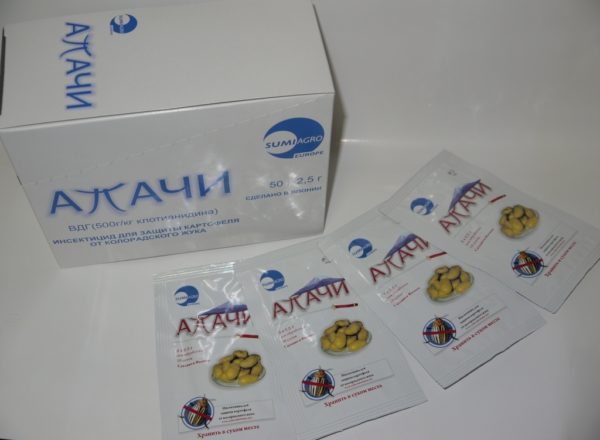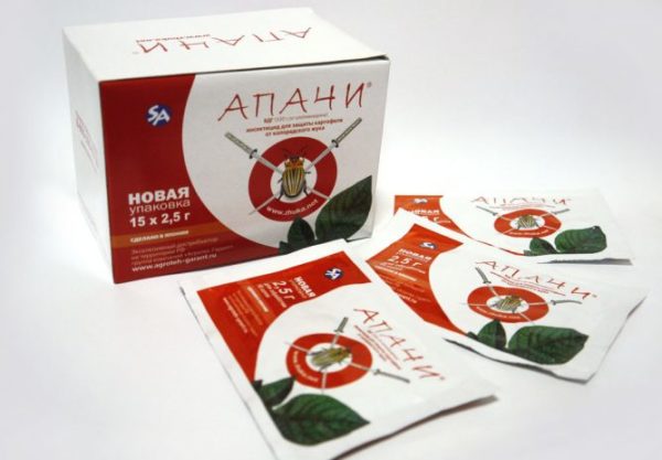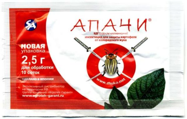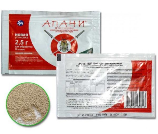 콜로라도 감자딱정벌레용 아파치 해충 방제 제품은 인체에 완전히 안전하다고 할 수 없으며, 러시아어 사용 설명서에는 이에 대한 모호한 경고가 포함되어 있습니다. 그러나 기존 제품에 비해 사용이 훨씬 편리합니다. 네오니코티노이드는 과립 또는 분말 형태로 1kg당 500g(1:2 비율)으로 함유되어 있으며, 흰색 호일 백과 골판지 상자에 꼼꼼하게 포장되어 있어 개봉하지 않은 상태에서는 물론 집에 보관하더라도 영향을 받지 않습니다.