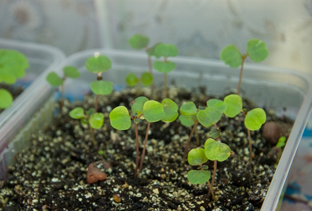 일주일 후 비닐 랩을 완전히 제거하고 분무기로 흙을 적셔주세요. 어린 묘목은 아침, 저녁, 그리고 흐린 날에는 추가적인 조명이 필요합니다. 뿌리 썩음을 방지하려면 화분에 물을 주는 것이 가장 좋지만, 물이 고이지 않도록 주의하세요. 묘목이 1.5~2cm 높이로 자라면 뽑아내고, 잎이 완전히 나오면 개별 화분에 옮겨 심습니다.