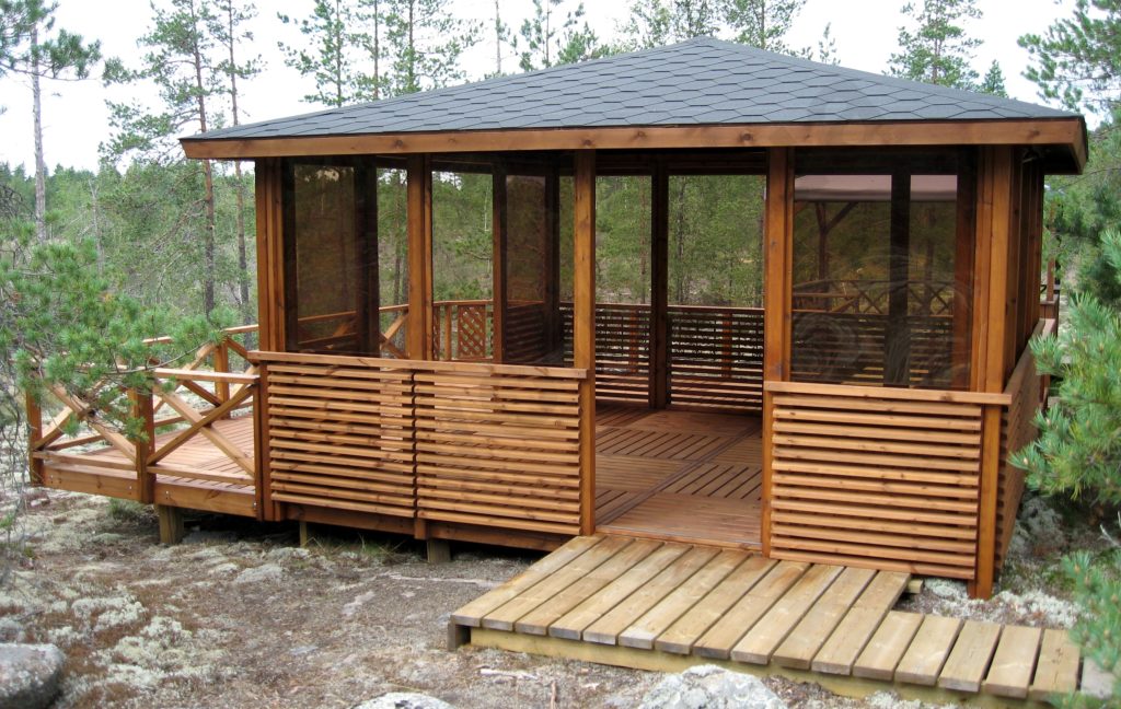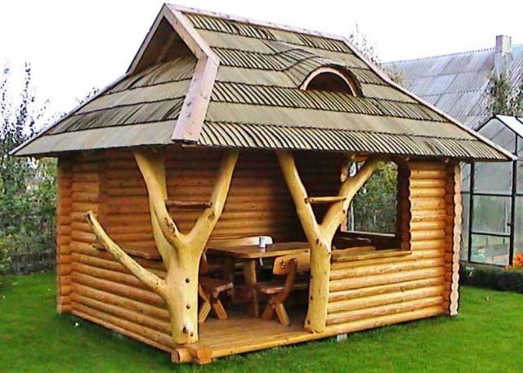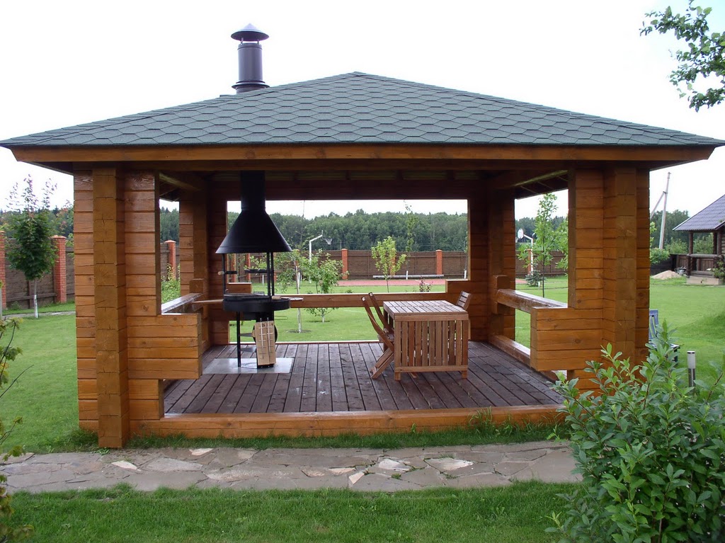 - 목조 가제보. 목조 가제보는 시골집에서 휴식을 취하기 위한 가장 인기 있는 개방형 구조물입니다. 목조 건축은 간단하며, 최소한의 기술과 도구만 필요합니다. 목조 구조물은 튼튼한 기초가 필요하지 않으므로 콘크리트 블록, 얕은 타설 기초 또는 콘크리트 슬래브 설치만으로 충분합니다. 지붕 재료는 무엇이든 사용할 수 있습니다. 완성된 구조물은 해충, 날씨, 그리고 난연제로부터 재료를 보호하는 화합물로 처리해야 합니다. 이러한 유형의 구조물의 장점은 시공이 간편하고 어떤 형태든 만들 수 있다는 것입니다. 목조 구조물의 단점은 수명이 짧다는 것입니다.