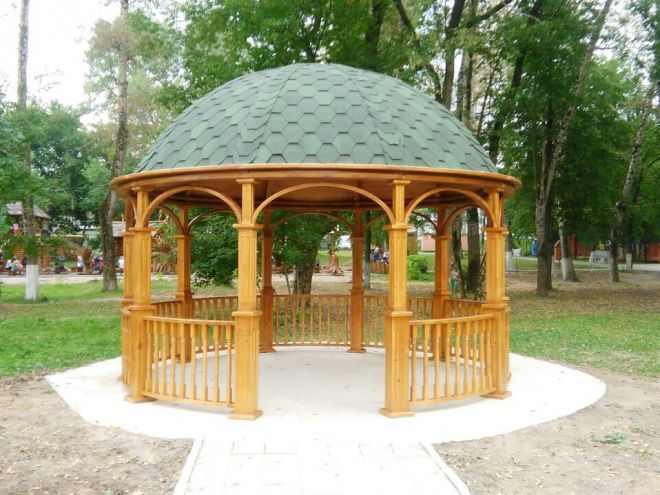 - 견고한 지붕과 다양한 구조의 벽을 갖춘 전통적인 지붕형 구조물입니다. 고전적인 여름 파빌리온은 나무, 금속 또는 벽돌로 된 견고한 벽을 최대 절반 높이까지 쌓을 수 있습니다. 윗부분은 개방된 상태로 두거나, 연철, 슬레이트 격자로 마감하거나, 폴리카보네이트, 유리 또는 유리섬유로 덮습니다.