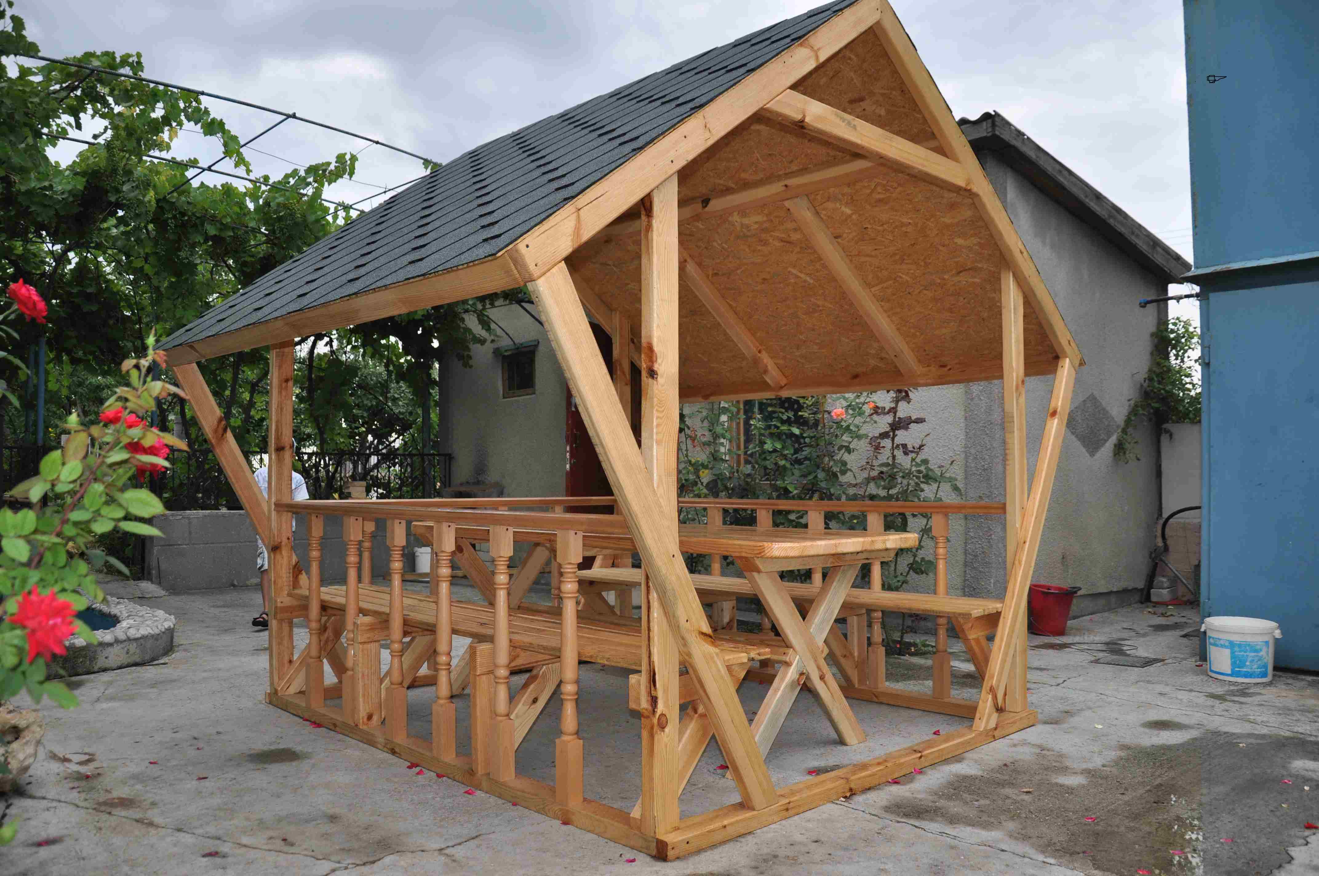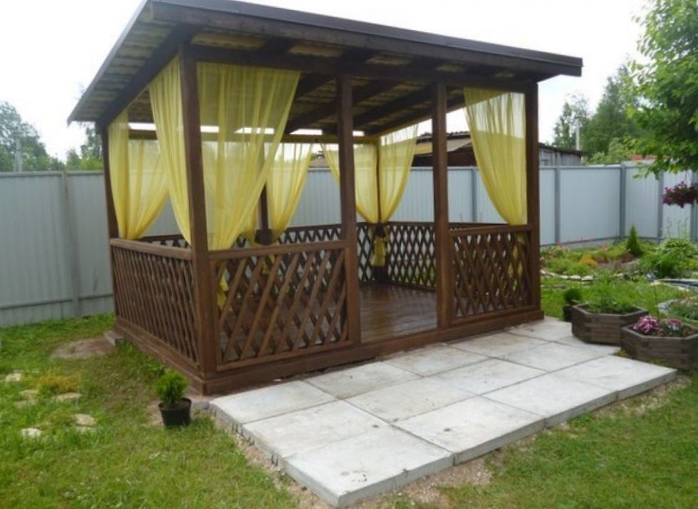 가장 단순한 형태의 정자입니다. 벤치와 그 위에 세워진 캐노피로 구성된 개방형 구조물입니다. 단점은 바람이나 비스듬한 비를 막을 수 없다는 것입니다. 기초가 필요하지 않습니다.