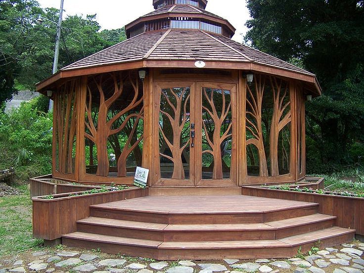 - 오리엔탈 스타일 - 지붕 모양이 주요 특징인 독창적인 디자인의 가제보입니다. 지붕은 일반적으로 가장자리를 향해 굽은 서까래로 지지됩니다. 구조물은 오리엔탈 스타일의 장식 요소로 추가적으로 장식됩니다. 건축에는 주로 나무나 돌이 사용됩니다.