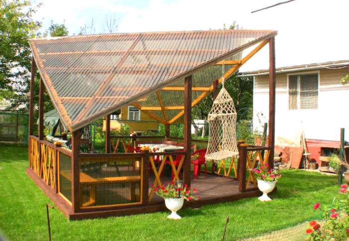 - 폴리카보네이트 가제보. 폴리카보네이트 구조물은 최근 교외 지역에 등장하기 시작했습니다. 시공에는 1~2일이 소요됩니다. 목재 보로 만든 프레임을 설치하고 폴리카보네이트 시트를 부착하기만 하면 됩니다. 폴리머 시트는 지붕재로도 사용됩니다. 건축 자재 시장에서는 다양한 색상의 폴리카보네이트를 판매합니다. 몇 시간 만에 설치할 수 있는 넓고 채광이 좋은 구조물을 만들 수 있으며, 가볍고 해체가 간편하며 투자 비용도 최소화할 수 있습니다.
