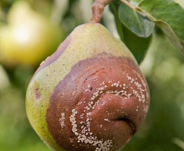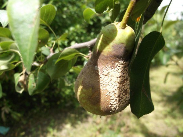 병원균은 배 열매를 공격합니다. 갈색 반점이 나타날 수 있습니다. 시간이 지나면 그 자리에 회색 곰팡이 포자가 형성됩니다. 이러한 곰팡이 포자는 돌풍을 타고 과수원의 다른 과일을 감염시킬 수 있습니다. 감염된 과일은 과육이 썩어 덩굴에서 말라 죽거나 완전히 떨어집니다. 이 병은 배의 성숙기, 습하고 더운 환경에서 빠르게 확산되며, 보통 여름 후반기에 발생합니다. 감염된 과일은 수거하여 폐기해야 합니다. 가을과 봄에는 예방 조치로 보르도 액상 용액 1% 또는 라임유(용액 1kg을 물 10리터에 희석)를 살포하십시오.