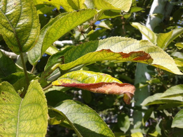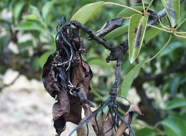 이 질병은 새싹 가장자리의 잎이 노랗거나 검게 변하기 시작할 때 나타납니다. 잎이 말라 죽습니다. 가지에도 같은 일이 발생할 수 있습니다. 배나무의 열매와 잎은 수분 부족, 토양에 석회가 너무 많거나 철분 함량이 낮으면 검게 변합니다. 이 질병은 나무에서 과일을 완전히 고갈시킬 수 있습니다. 잎의 노란 반점을 제거하려면 황산제일철 용액을 사용하십시오. 용액 20g을 물 한 통에 넣으십시오. 항염소제도 사용할 수 있습니다. 용액 100g을 물 10리터에 넣으십시오. 이 용액을 나무 뿌리에 붓습니다. 이 질병이 다른 식물에도 감염되었을 경우, 줄기 주변의 토양을 파내어 황산제일철 용액(물 10리터당 100g)을 뿌립니다.