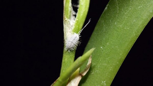 유충은 위험합니다. 식물의 수액을 빨아먹습니다. 피해를 입으면 난초는 노랗게 변하고 모양이 사라집니다. 이 곤충은 쉽게 알아볼 수 있습니다. 흰색이고 작은 벌레와 비슷합니다.