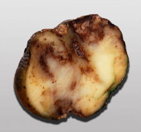 감염원은 토양입니다. 박테리아는 포복경, 기공, 그리고 줄기와 뿌리의 여러 상처를 통해 덩이줄기로 침투합니다. 박테리아가 증식하면서 식물의 혈관에 갈색 점액질이 채워지고, 잎이 시들어집니다. 온도가 27°C 이상이고 습도가 높을 때 발생합니다. |