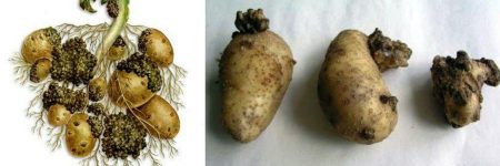 더듬이병에 걸린 감자는 모양이 좋지 않고 보관도 어렵습니다. 표면에 "사마귀"(농포)가 생기고, 시간이 지나면 말라서 갈라집니다. 농포에서 포자가 파괴된 감자 조직과 섞인 마른 덩어리가 흘러나옵니다. 뿌리에는 흰색 혹이 생기고, 나중에는 검게 변합니다.