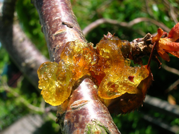 복숭아 검(Peach gum)은 나무껍질 손상으로 인해 세포 기능이 저하되어 발생합니다. 나무에 전분을 함유한 세포가 나타납니다. 전분 세포의 세포벽이 용해되면 균열에서 액체가 새어 나옵니다.