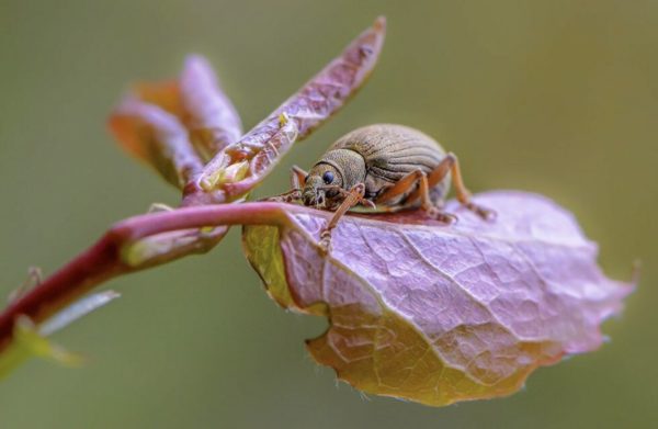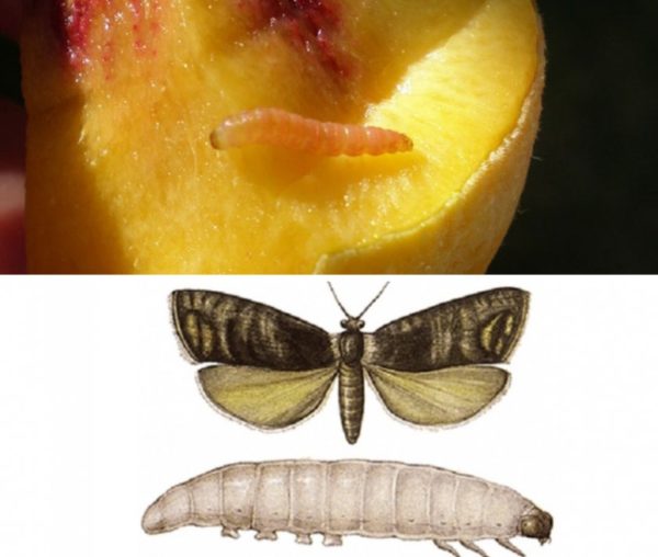 복숭아 열매에 심각한 피해를 입힙니다. 바구미는 흙과 낙엽 속에서 겨울을 나는 회색 딱정벌레입니다. 유충은 열매 안에 사는 흰색 벌레입니다. 피해의 원인은 살충제 처리가 시기적절하지 않거나 전혀 이루어지지 않은 것입니다.