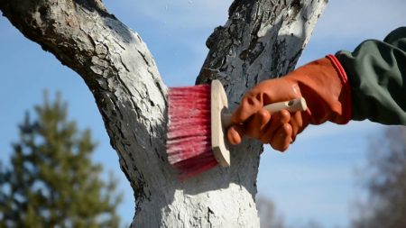 백색화 작업은 건조한 날씨에만 해야 하며, 불필요한 요소를 나무껍질에서 제거하고 살충제, 화학 물질 또는 해충과 질병에 대한 민간 요법으로 처리해야 합니다.