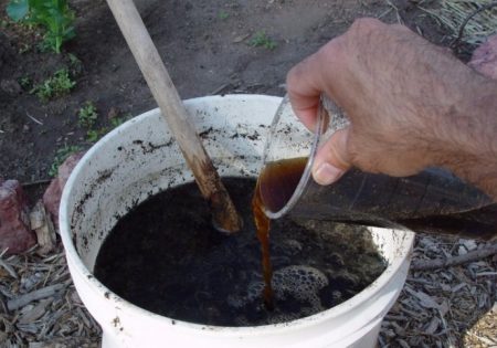 용액을 준비하려면 신선한 뮬린 1리터를 물 10리터에 넣습니다. 물 10리터 대신 새똥 500ml를 사용할 수 있습니다. 용액에 과인산염 40~50g을 넣고 10~12일 동안 그대로 두세요. 사용하기 전에 물과 1:1 비율로 희석하세요.
