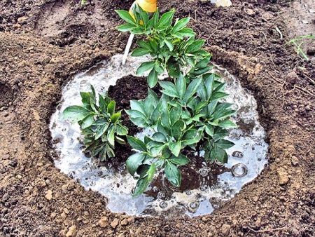 먹이 주는 방법은 다음과 같습니다. 모란 주변에 20cm 간격으로 10~15cm 깊이의 작은 고랑을 만듭니다. 덤불 하나당 혼합물 한 통을 사용합니다.
