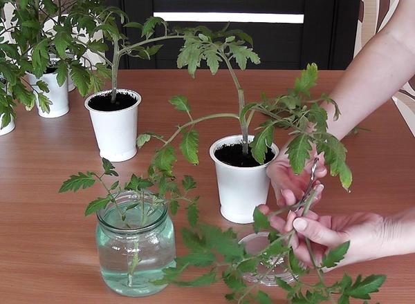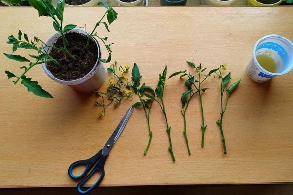 최소 7cm 길이의 줄기 꺾꽂이는 마디 두 개를 사용하여 뿌리가 잘 내리도록 합니다. 꺾꽂이할 덤불을 검사하고 가위로 여러 부분으로 나눕니다. 일반 토마토 품종은 이러한 목적에 적합하지 않습니다. 영양번식은 일반적으로 여러 개의 곁가지(무한생장과 유한생장)를 생성하는 품종에 사용됩니다.
