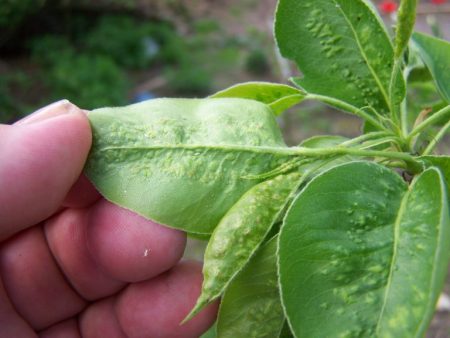 이른 봄. 기온이 섭씨 16도까지 올라가자마자 해충이 배나무 잎을 공격하기 시작합니다. 잎에 흑갈색의 부풀어 오른 혹이 생기기 시작하는데, 이 혹에서 혹응애가 서식하고 번식합니다. 건조한 날씨에 매우 빠르게 번식하는 혹은 잎에 형성되어 우유 같은 수액을 빨아먹습니다. 그러면 식물은 광합성을 멈추고 약해집니다. 잎은 검게 변하고 말려 떨어지게 됩니다.