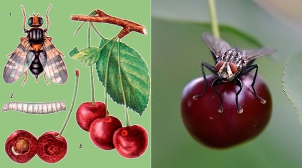 3. 성충 파리는 5월 말에서 6월 중순 사이에 우화합니다. 우화 후 약 2주 후에 산란을 시작하며, 산란관으로 체리나 사워 체리 열매를 뚫고 껍질 아래에 알을 낳습니다. 열매 껍질에 검은 점이 보입니다. 파리는 껍질을 뚫고 과일 과육에 알을 낳습니다.