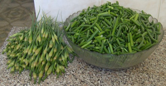 - 통조림을 만들기 직전에 마늘싹을 끓는 물에 데친 다음, 찬물을 끼얹습니다.
