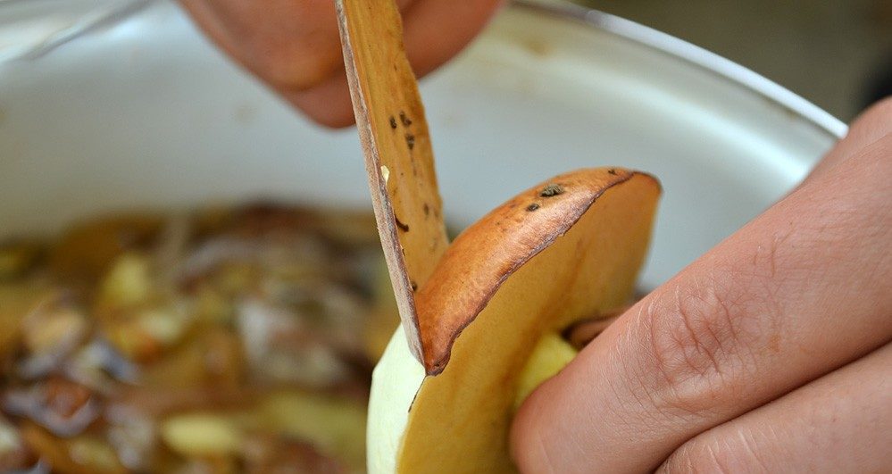 깨끗한 천을 준비하여 식물성 기름에 적셔주세요. 이 천으로 모든 버섯의 뚜껑, 장갑, 칼을 닦으세요. 칼끝으로 필름을 들어 올려 천천히 몸 쪽으로 당겨주세요. 이렇게 하면 필름이 찢어지지 않고 쉽게 벗겨지고, 뚜껑도 매끈하게 유지됩니다. 필름이 찢어지거나 고르지 않게 벗겨지면 칼로 남은 필름을 조심스럽게 긁어내세요.