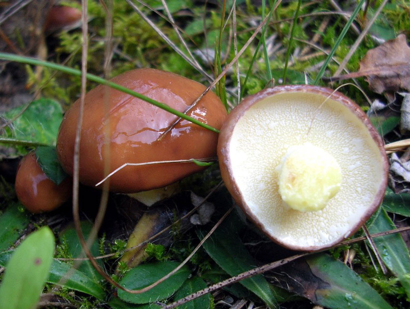 어린 버섯의 갓은 반구형이지만, 시간이 지남에 따라 납작해집니다. 갓과 줄기 모두 먹을 수 있습니다. 버터버섯을 구별하는 독특한 특징은 관 모양의 자실층입니다. 갓 아랫부분에 있는 세관은 버터버섯과 독성이 있는 자실체를 구별하는 데 도움이 됩니다.
