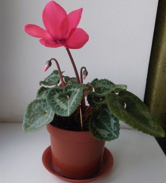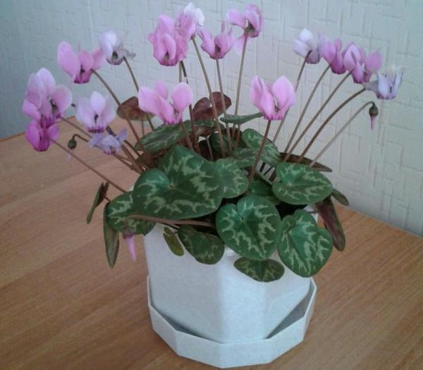 시클라멘 꽃은 뾰족한 날개를 가진 나비와 비슷합니다. 꽃잎은 약간 뒤로 굽어 있으며 길이는 2~3cm입니다. 한 덤불에 최대 60개의 꽃봉오리가 맺힙니다. 이 꽃은 정말 화려해 보입니다.