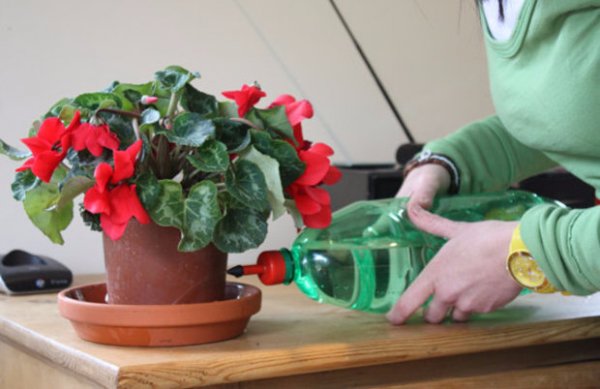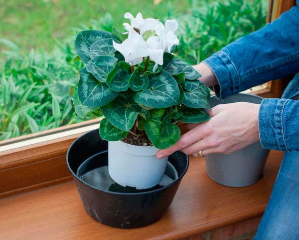 시클라멘은 흙 위에 직접 물을 주지 않고 화분에 물을 주는 것이 좋습니다. 이렇게 하면 덩이뿌리와 생장점에 수분이 스며드는 것을 방지할 수 있습니다. 물은 화분의 배수구를 통해 흙으로 흡수됩니다.