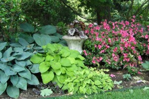 그늘진 곳에는 꽃 외에도 다른 그늘을 좋아하는 식물들이 심어집니다. 정원사들은 울타리 옆이나 나무 아래에 큰 관목을 심는 경우가 많습니다.