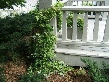 키가 2~2.5m에 불과한 소형 야생 포도 품종입니다. 보호하지 않으면 영하 20도까지 견딜 수 있어 화분이나 화분에 심는 것이 인기가 많습니다. 화분에 심은 식물은 발코니에서 잘 자라며, 서리가 내리면 실내로 옮겨 심습니다. 연두색에 흰색 맥이 있는 둥글고 손바닥 모양의 겹잎이 장식적으로 아름다우며, 가을에는 자줏빛으로 물듭니다.