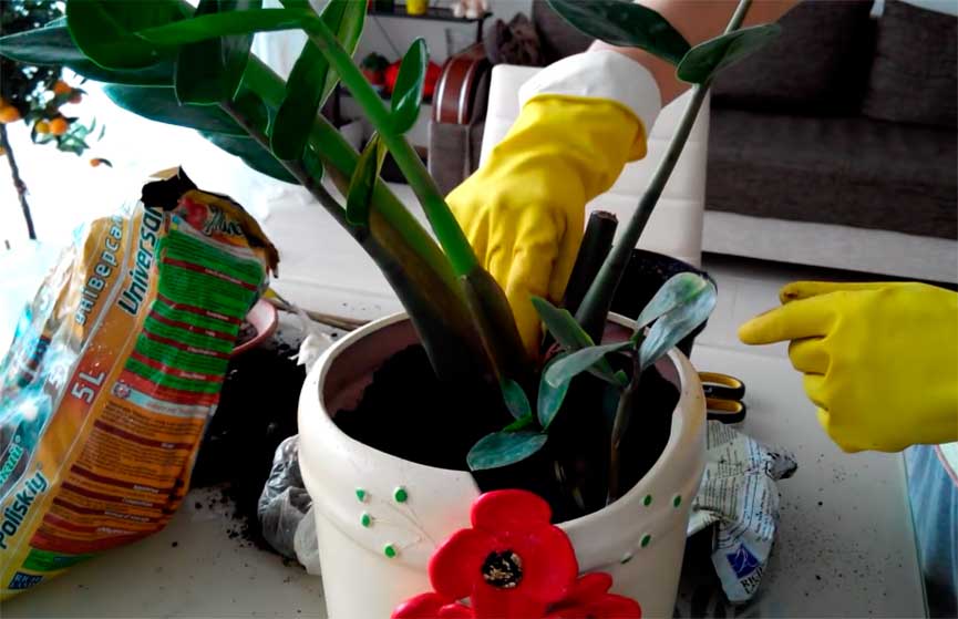 자미오쿨카스 토양 - 용기가 준비되면 환적 방법을 사용하여 실제 분갈이를 시작할 수 있습니다. 이를 위해 식물과 뿌리 덩어리를 이전 용기에서 꺼내 새 화분에 옮겨 심습니다. 덩이줄기가 흙에 완전히 묻히지 않도록 하고, 0.5~1cm 정도만 흙에 묻어 두어야 합니다.