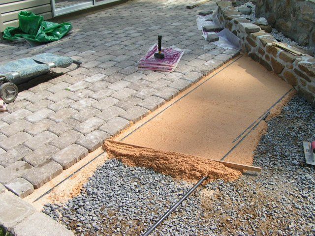 깔린 모래는 전문 가솔린 래머로 다집니다. 15x45cm 크기의 받침대가 부착된 목재로 만든 수제 도구를 이 목적으로 사용할 수도 있습니다. 표토층이 침식되지 않도록 얕은 물뿌리개로 모래를 주기적으로 적셔주고 다시 다집니다.