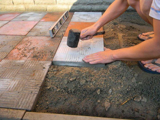 각 포장 슬래브는 고유한 패턴을 가지고 있으며, 이는 조각의 크기와 모양에 따라 선택됩니다. 포장돌은 모래바닥 위에 서로 단단히 밀착하여 놓고 고무망치로 누릅니다. 필요한 경우 넓은 모종삽으로 수평을 맞추고, 여분의 모래를 더하거나 제거합니다. 깔린 조각은 표준 수평계로 주기적으로 점검합니다. 하지만 완벽한 수평 조정은 필요하지 않습니다. 포장돌을 깔는 작업은 전체 길이 메워질 때까지 계속됩니다.