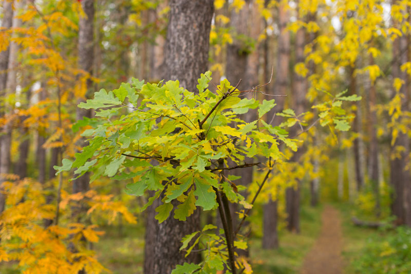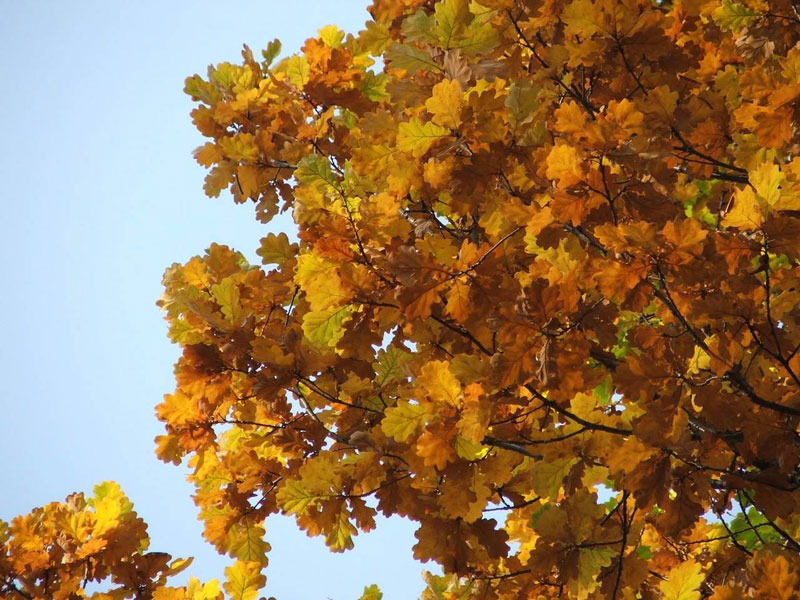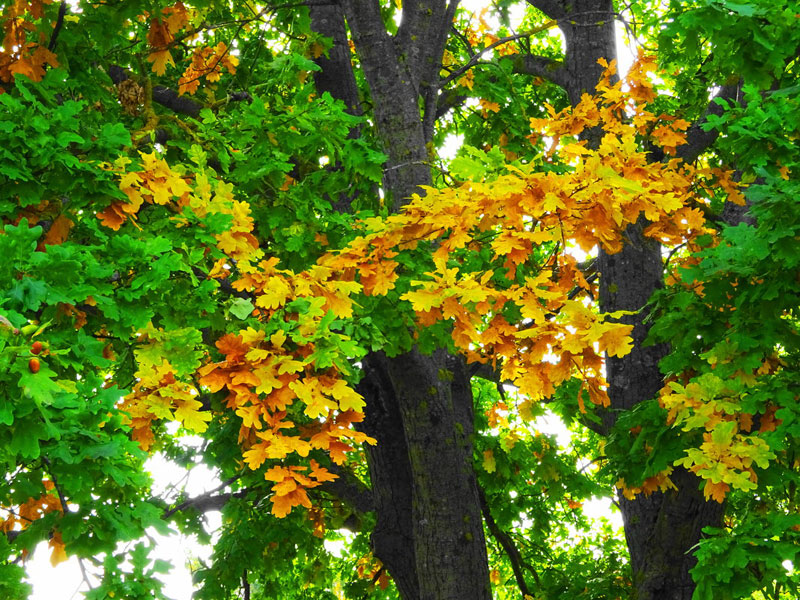 가을 숲에서 발견되는 참나무는 아름다운 자태를 그대로 간직하고 있습니다. 잎은 녹색에서 밝은 노란색으로 변합니다. 가을의 첫 몇 달 동안은 잎이 호박색을 띠다가 겨울이 다가오면 말라 갈색으로 변합니다.