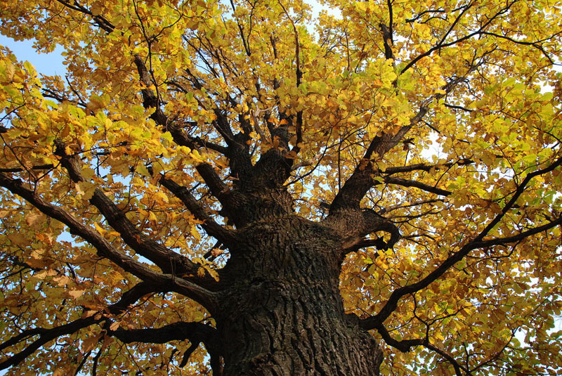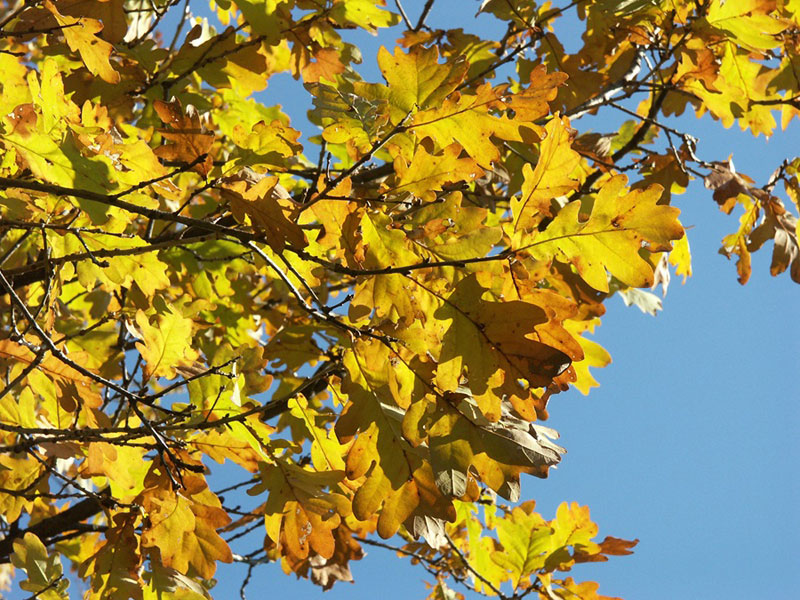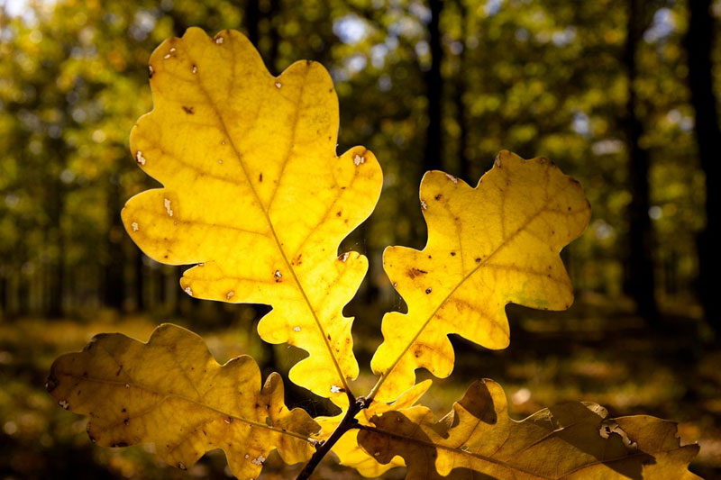 가을의 참나무는 아름다운 광경입니다. 웅장하게 솟은 노란 잎사귀가 시선을 사로잡습니다. 겨울 참나무 잎이 말라붙으면 가지에 그대로 남아 고요하고 신비로운 겨울 바스락거림으로 시선을 사로잡습니다.