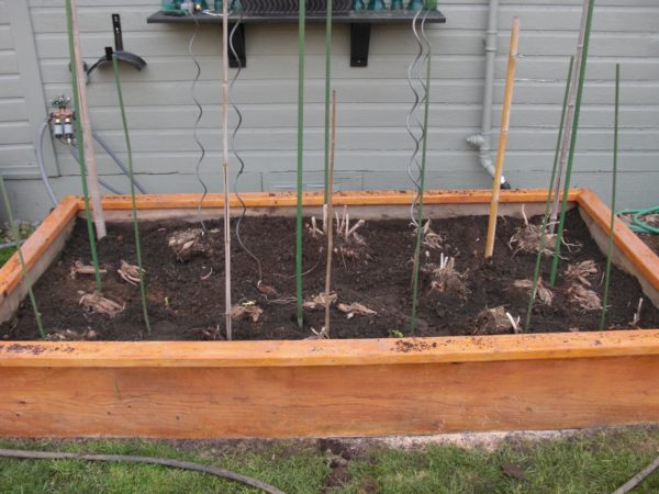 키가 큰 달리아 품종은 지지대와 지지대가 필요합니다. 두껍고 튼튼해 보이는 줄기조차도 실제로는 매우 약해서 바람이나 꽃의 무게에 쉽게 부러질 수 있습니다. 지지대는 튼튼해야 하며, 지지대의 높이는 품종과 수풀의 높이에 따라 달라집니다. 이상적으로는 심을 때 뿌리가 손상되지 않도록 덩이줄기와 함께 지지대를 땅에 묻어주는 것이 좋습니다.