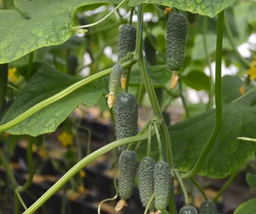 잡종을 수직으로 재배하면 정원사들은 토양에 장시간 접촉하여 과일이 썩는 문제를 겪지 않습니다. 덩굴에 매달린 오이는 따기도 쉽고, 더러워지지도 않으며, 물주기도 간편합니다.