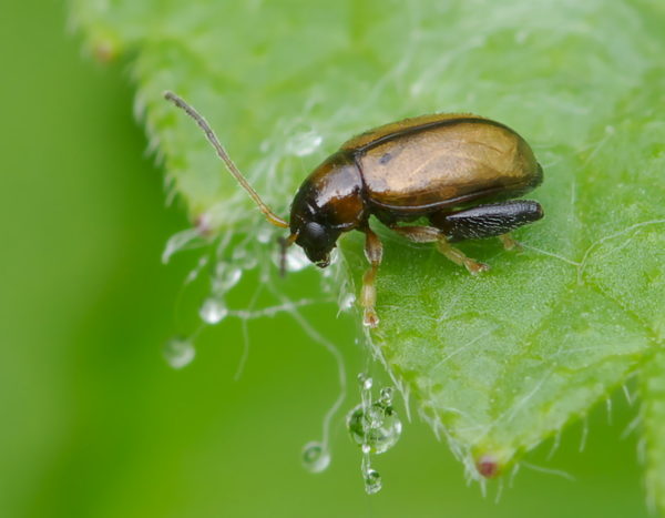 4~5mm 길이의 딱정벌레는 잎 뒷면에 알을 낳습니다. 한 번에 최대 20개의 알을 낳으며, 한 계절에 낳는 알의 수는 300~500개에 달합니다. 유충은 황록색에 검은 털이 많고 잎의 과육을 먹습니다. 애벌레와 성충은 잎맥만 남기고 잎의 연조직을 모두 먹어 치웁니다.