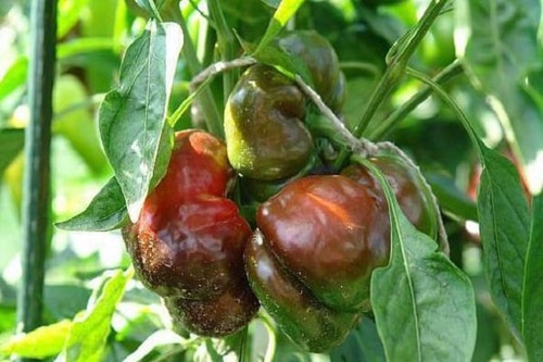 온실에 있는 고추는 알터나리아 시들음병으로 인해 검게 변합니다. 잎에 검은색과 갈색의 각진 반점이 나타나 점차 열매로 번집니다. 처음에는 물에 젖어 있다가 나중에는 검게 변하고 곰팡이가 핀 막으로 뒤덮입니다. 곰팡이가 자라면서 고추 전체가 썩습니다. 곰팡이 포자는 습도가 높고 더운 날씨에 빠르게 퍼지고, 균사체도 고추 씨앗을 공격합니다.