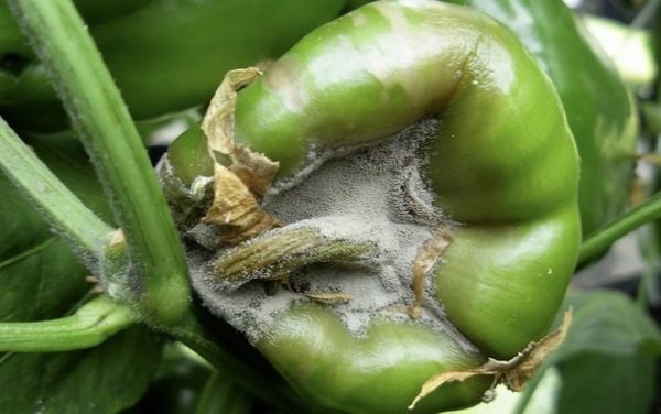 이 병은 16°C 이하의 저온과 75~80%의 높은 습도에서 확산됩니다. 이 곰팡이는 줄기, 줄기, 그리고 열매의 기부를 공격합니다. 식물의 일부는 흰색으로 덮이고, 그 아래에는 검은 반점이 생깁니다. 고추는 무르게 됩니다.