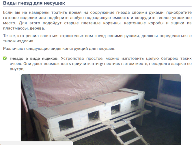 예전에는 많은 사람들이 건초가 가득 든 간단한 상자로 만족했지만, 오늘날 전문 양계 농가들은 이 부분에 더욱 꼼꼼함을 기울여 암탉의 삶을 더욱 편안하고 자신들도 더 편하게 만들고 있습니다. 많은 사람들이 직접 만들기를 꺼리는 소위 '계란 수집가'에게도 마찬가지입니다. 하지만 자신의 능력을 의심하지 마세요. 아주 간단합니다.
