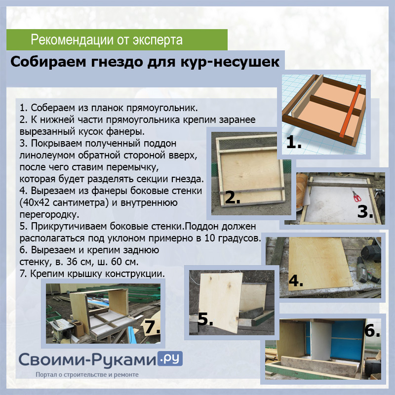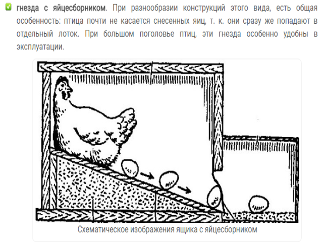 - 계란 수집기를 사용한 수제 산란 둥지의 크기는 개별적으로 결정되며, 예시 사진을 사용할 수 있습니다. 양계장용으로 설계된 기성품도 있지만, 가정용으로는 적합하지 않습니다. 이러한 디자인은 수익성이 낮고 가격이 비싸며, 많은 수의 닭을 키우는 데만 적합합니다. 직접 둥지를 만드는 데는 여러 가지 미묘한 차이가 있지만, 단계가 간단하여 전체 과정을 5~6시간 안에 완료할 수 있습니다(위 사진 참조).