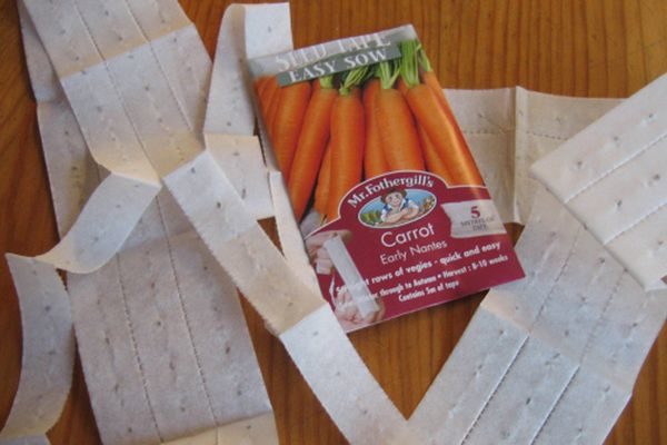 종이 띠에 당근을 심으면 기존 파종 방식보다 심는 데 필요한 재료가 세 배나 적게 사용되어 시간과 비용을 절약할 수 있습니다. 씨앗은 모두 같은 깊이에 고르게 분포됩니다. 종이 띠는 미리 준비하여 돌돌 말아 심기 전까지 보관합니다. 남은 작업은 봄에 고랑을 파고 띠를 깔고 흙을 덮은 후 물을 주는 것뿐입니다.
