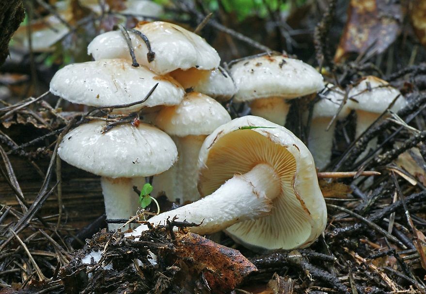 흰말버섯은 겉모습이 메도우꿀버섯과 매우 비슷합니다. 이 버섯은 야외에서도 자랍니다. 편평하거나 움푹 들어간 흰색 갓은 희끄무레한 빛깔을 띠며, 습한 날씨에는 끈적끈적해집니다. 갓에 볼록한 중앙이 없는 것이 중요한 특징입니다. 또한, 노란색 아가미가 더 촘촘하게 배열되어 있어 이 버섯이 이 종에 속함을 나타냅니다.