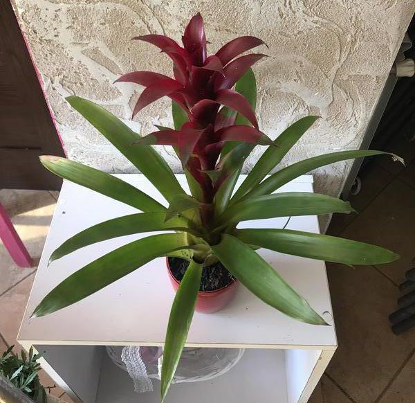 - 핏빛 붉은 구즈마니아입니다. 넓은 로제트 모양 잎이 반쯤 붉은색을 띠고 있습니다. 꽃차례는 꽃자루가 아닌 로제트 안에 있습니다.