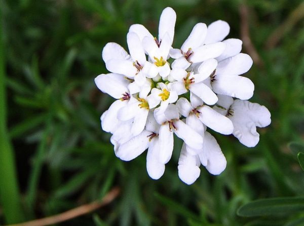 - 이베리스 톰 썸, 높이 15cm의 덤불, 흰색 꽃;