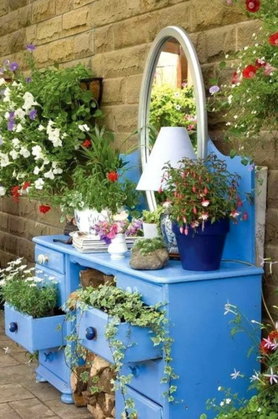 집 주변이 콘크리트라면 아름다운 화단을 놓칠 이유가 없습니다. 오래된 서랍장을 여러 간격으로 꺼내고, 그 위에 식물, 특히 덩굴식물을 심으면 화단을 만들 수 있습니다. 윗뚜껑에는 화분을 놓을 수 있습니다.